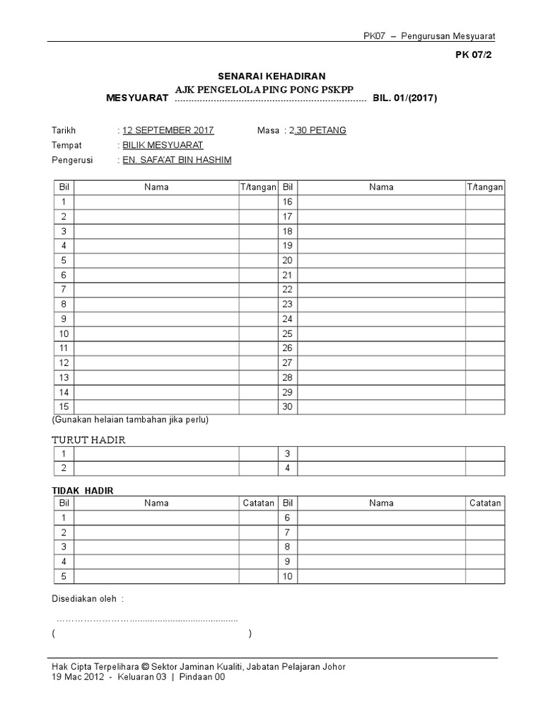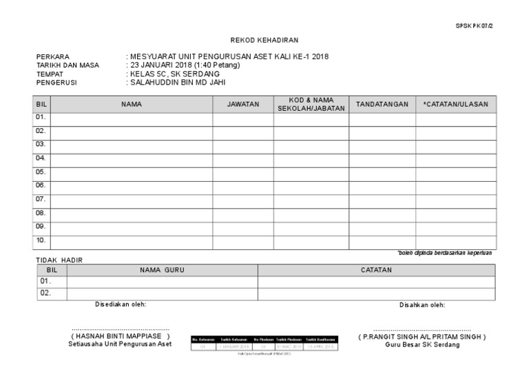 Borang Pk 07 2 Senarai Kehadiran Mesyuarat Pdf
